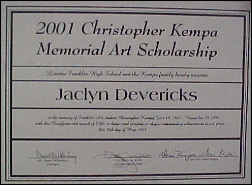 A memorial scholarship has been set up in Chris' memory. At the end of each year a $1000 scholarship is awarded to a Franklin High School Senior pursuing further education in fine art.